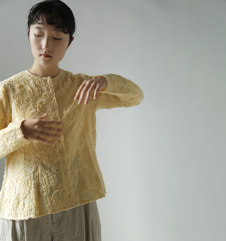 こちらのブラウスは、 二〇二四春夏でつくった厨房で働く人をイメージしたアイテムです。 使用する生地は、細いナイロンとコットンで織られた群馬のペイズリー柄カットジャカードです。手作業で切り毛足を揃えた後、色を乗せ天日で自然に乾かしシワ感を持たせたまま仕上げています。