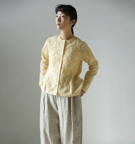 ブラウスとして、そしてジャケットとして、普段使いの可愛さと「ここぞという日に信頼できる」任せられる一着です。 デニムやリネンパンツと合わせれば日常の装いにさりげない華やぎを添え、 式典や集まりの場では、その上品な雰囲気と繊細な柄が静かな存在感を放ちます。