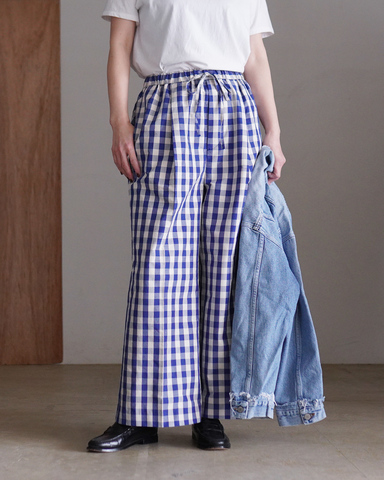 爽やかなブルーのギンガムチェックが目を惹く、春夏シーズンに映えるワイドイージーパンツ。ゆとりのあるストレートシルエットが縦のラインをすっきりと見せ、フラットシューズを履いてもバランス良く決まります。