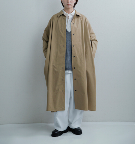クラシックなシャツディテールをベースにしながら、丸みのあるフォルムとワイドなシルエットで現代にアップデート。ロング丈ならではの存在感が、着こなしに自然な洗練さを添えます。