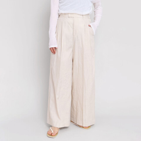 ナチュラルでツヤ感のある素材を使用した、カジュアルなワイドパンツ。