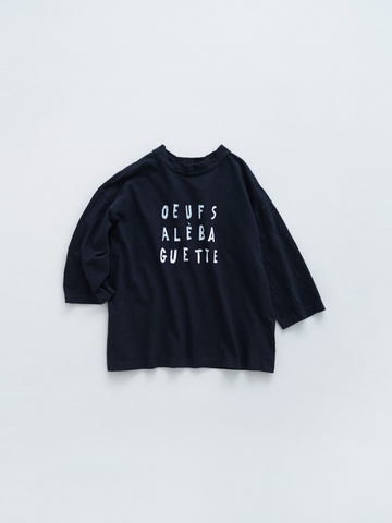 フロントには、oeuf (ウフ=卵) ・sal (ソル=塩) ・baguette(バゲット)の文字をランダムに並べ、半熟たまごをバケットですくって食べる朝ごはん、という意味のプリント入りです。