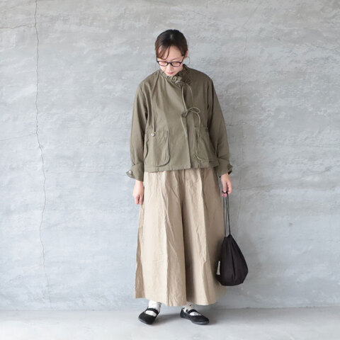 綿・ヘンプ混の生地を使用しており、さらりとした肌触りとややハリ感のある生地が特徴の一着です。