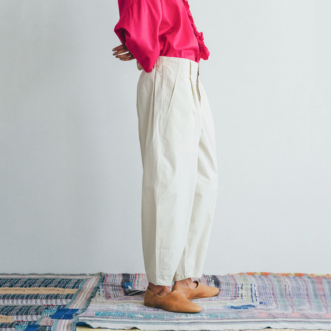 ウエストのタックとゴム、裾のダーツにより立体的なフォルムを楽しめます。ボリュームがありながらも九分丈のレングスでスッキリ着用いただけます。
