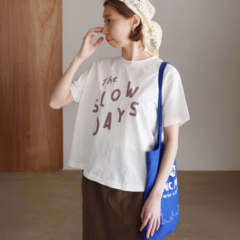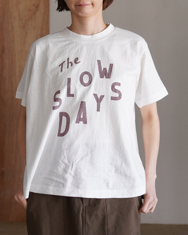 フロントには「The SLOW DAYS」のロゴをあしらい、シンプルな着こなしに軽やかなアクセントを添えてくれる一枚。
