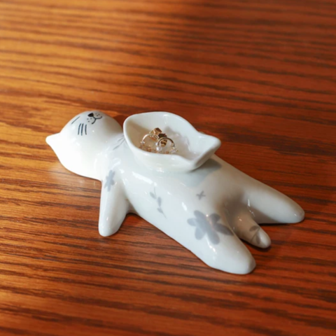 愛らしい花柄をまとった磁器製の猫のインセンストレイ。
