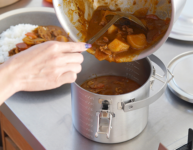 自宅での料理の保存はもちろんのこと、外への持ち運びにも便利な「給食缶ミニ」。汁物でも漏れない構造になっているので、親戚や知人へ料理をお裾分けする時や、アウトドアでも活用できます。