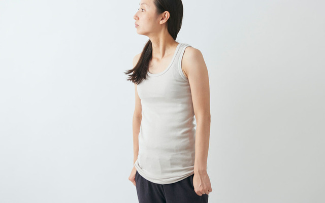 着心地と肌触り良く、手入れも簡単。通年、頻度高く、長く着られるyohakuの定番インナーのタンクトップです。