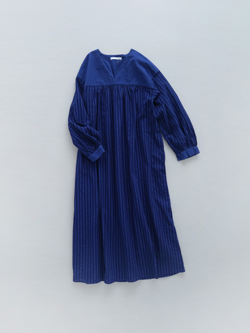 ゆったりと締め付け感のない、快適な着心地のワンピース。胸元の高い位置からからぐるっと切り替えを入れ、重心を上に引き上げることで全身のバランスを整えています。細かいギャザーを寄せ、ふんわりとしたシルエットに。ほんのり甘さはありつつ、しっかりと着丈があるので、大人っぽく着ることができます。