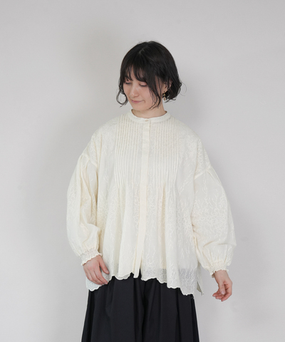 ほどよいシアー感のある、さらりとしたポリエステル生地にコットン糸で刺繍を施したブラウスです。