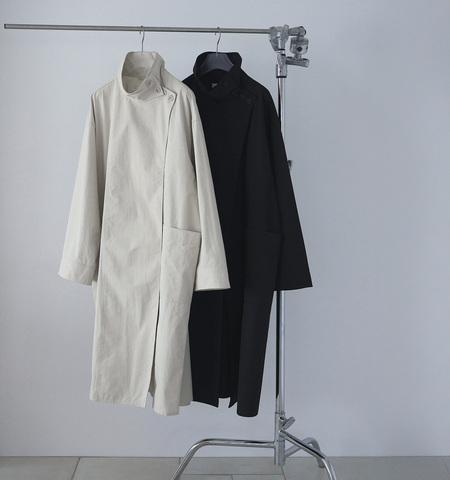 高めに設定したスタンドカラーと、トップのみにボタンを配したラフなフロントデザインが特徴のロングコート。