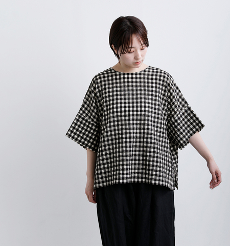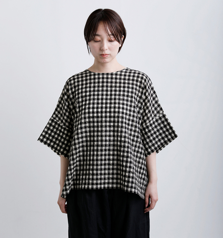 シアー感のあるギンガムチェックが涼やかな一枚。その日の気分やボトムスに合わせて、前後どちらでも着用できる2wayデザイン。先染めの糸を使用した、凹凸感のあるサッカー調のギンガムチェック生地を採用しました。