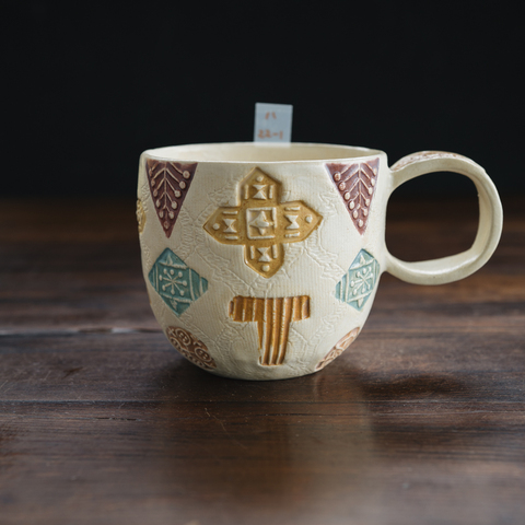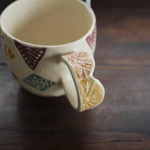土の素材を感じるざらりとした質感。その上を自由に絵付けされているようで絶妙なバランスや配置、余白感で可愛さをギューっと詰め込みつつも洗練された作りになっています。
