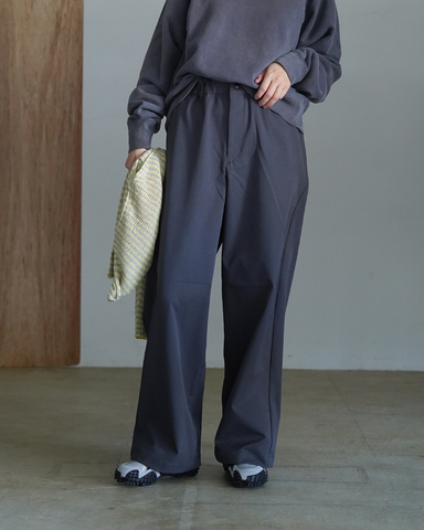 バックポケットはヒップラインに沿ったカーブラインを活かして配置されています。ウエストはゴム+スピンドル仕様でリラックスした穿き心地。ベルトループ付きのため、きれいめからカジュアルまで幅広くスタイリングできます。