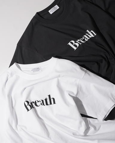 日常のノイズから少し距離を置き、深く息を整えるような感覚を言葉で表現。フロントには「Breath」のタイポグラフィをシンプルに配置し、背面にはブランドの世界観を象徴するレターグラフィックをプリント。