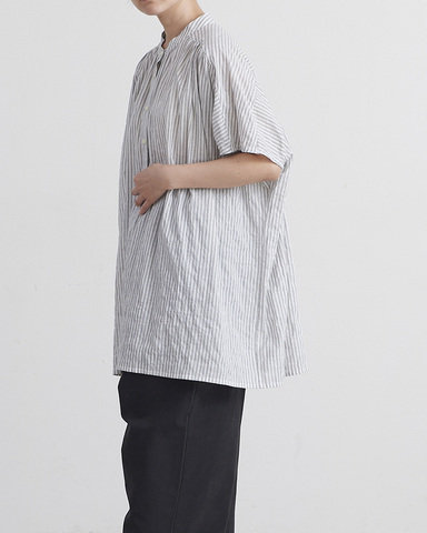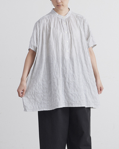 表情豊かなシャーリング生地が、清涼感と立体感を演出するヘンリーネックチュニック。国内生産ならではの丁寧な仕立てと、先染め生地の奥深い色合いが魅力の日本製です 。