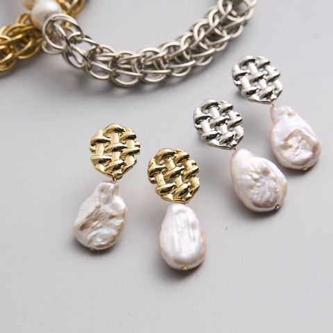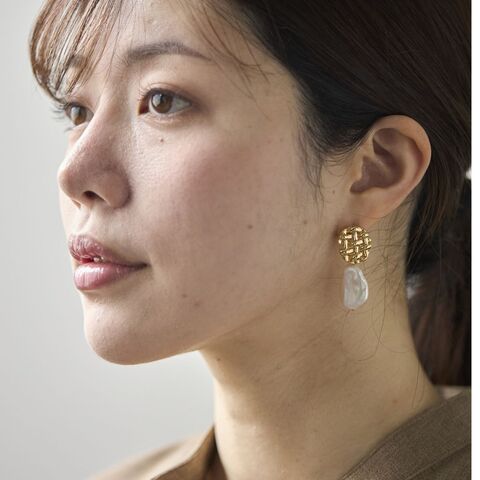 ブレイド淡水パールピアスはヴィンテージのパーツと大粒のバロックパールを組み合わせています。レトロな雰囲気を持つパーツとパールの組み合わせは、シックになりがちですが、パールをあえて形がいびつなバロックにすることで、力が抜けた雰囲気になっています。