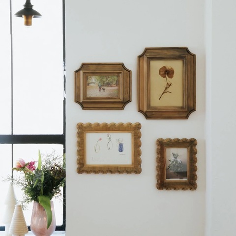 ヴィンテージライクな佇まいがアクセントになる、手彫りの天然木フレーム。