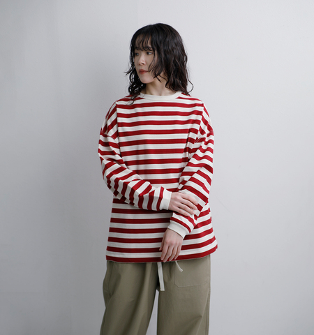 オリジナルで編み立てた度詰天竺ボーダーを使用した、クルーネックのロングスリーブTシャツ。しっかりと目の詰まった生地は適度なハリとコシがあり、身体のラインを拾いにくいのが特徴です。