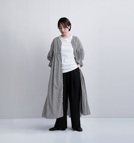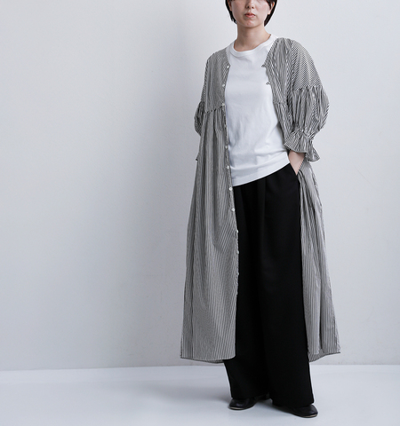 ストライプの凛とした表情と、たっぷりのギャザーが作る甘さのバランスが絶妙な一着。
