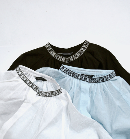 さりげなく華やぐ、衿元刺繍 繊細さとリラックス感を併せ持つ、 sosottoらしい一着。