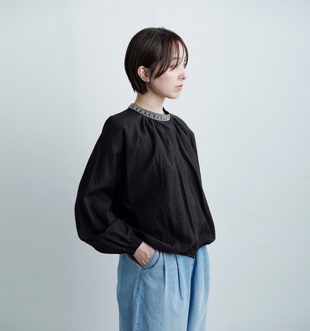 繊細な刺繍をあしらったネックラインが印象的な一枚。顔まわりに上品なアクセントを添え、シンプルな装いもぐっと洗練された雰囲気に。