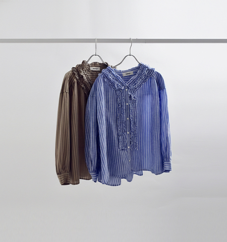 tumugu(ツムグ)より、ストライプ フリル ブラウス をご紹介します。程よい厚みがありながらも、清涼感のある細ピッチのリネン混ストライプ生地を使用。さらりとした肌あたりで、春から初夏にかけて心地よく着ていただけます。襟元や前立てにあしらわれたフリルが、甘さを抑えた上品なアクセントに。さらに配色刺繍を施すことで、シンプルなストライプの中にさりげない存在感をプラスしました。ゆとりのあるシルエットで、身体のラインを拾いにくくリラックスした着心地。デニムやワイドパンツに合わせてカジュアルに、スカートと合わせてやわらかな雰囲気にも。日常に自然と馴染みながら、着こなしを少しだけ特別にしてくれるブラウスです。