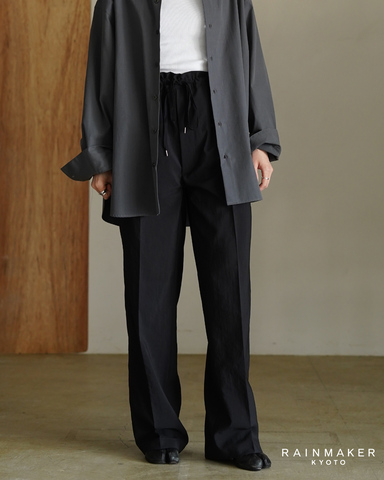 腰紐でサイズ調整が可能なイージー仕様でありながら、映りはあくまで端正。シンプルなカットソーやシャツと合わせるだけで、スタイリングに奥行きが生まれます。