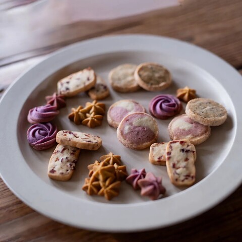 ドライクランベリーがアクセントになったさっくり食感のクランベリーサブレ、プレーン生地とピンク色のクランベリー生地がマーブル模様になったかわいらしいクランベリーマーブル、アールグレイの華やかな香りとホワイトチョコの調和が上品なアールグレイとホワイトチョコチップ、丁寧に鞘から取り出したバニラビーンズを使用した香りゆたかな紫芋バニラクッキー、シナモンがふわりと香るパンプキンシナモン。