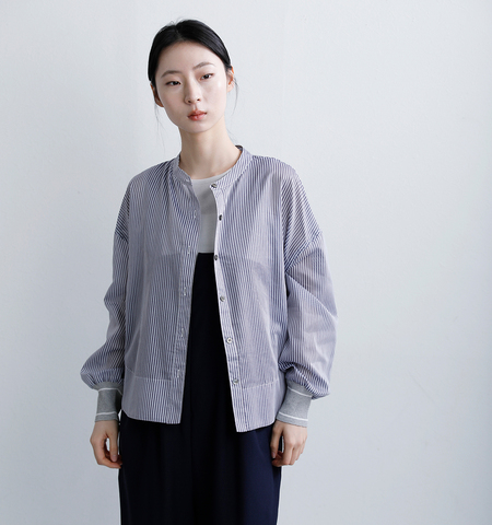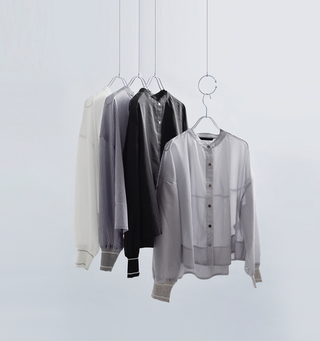 袖口にMunichらしくリブを使ったバンドカラーのシアーシャツ。袖から後ろ身頃につながる切り替えラインで立体的なふくらみのあるシルエットを作り、動きのあるバックスタイルに。ストライプ地を使うことで特徴的な切り替えラインがより引き立ちました。