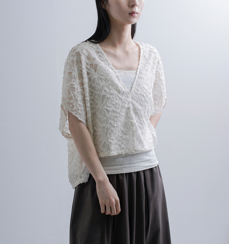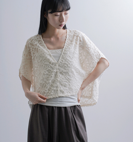 立体感のあるカットジャガード生地は、繊細な柄と奥行きのある表情が魅力。さりげない華やかさがありながらも主張しすぎず、スタイリングに上品なアクセントを添えてくれます。軽やかな着心地で、季節を問わず取り入れやすい素材感です。