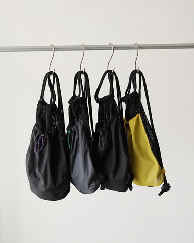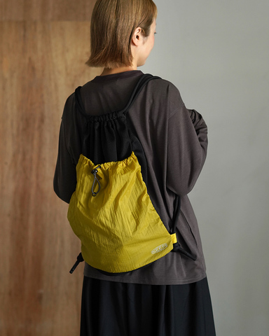 必要なものだけを心地よく持ち歩ける、暮らしに馴染むナップサック。リサイクルナイロンとメッシュ素材を組み合わせた軽量設計で、背負ったときも軽やかな印象です。
