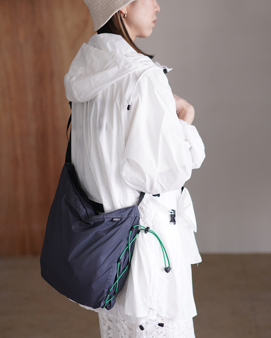 クロスボディで持った際も主張しすぎず、装いのバランスを自然に整えてくれます。マチ部分に配されたバンジーコードにより、荷物の量に応じてシルエットを調整できるのも魅力。