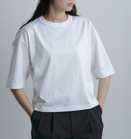 単体で着やすい肉厚感で、オールシーズン着用可能。身幅をゆったりとさせたシルエットのショート丈で、ハーフスリーブ(5分袖)タイプ。リラックスシーンはもちろん、タウンユースもしやすいデザインです。