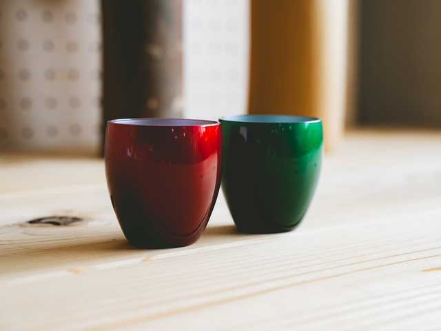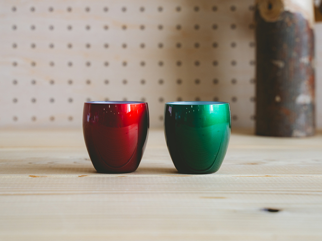 宮城県仙台市に伝わる伝統工芸、「玉虫塗(たまむしぬり)」はあでやかに照り返す発色と輝きがタマムシの羽根を思わせ、日本を代表する工芸品として、世界に輸出されました。もっとも小さな玉虫塗は、コロンと愛らしいグラスです。滑らかなガラス表面に玉虫塗を施し、透明感のある繊細な仕上がり。見た目や飲み口の軽さと、毎日使っても安心できるほどよい厚みを両立しました。