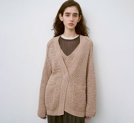 ボタンレスのカーディガン。キルトピンやベルトなどでアレンジしていただくのもおすすめです。