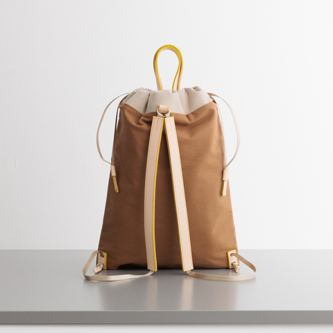 ナップザックのような形と、立体的なポケットが特徴的なバックパック。