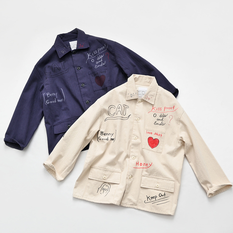 こちらは、サロ別注のカバーオールジャケット。プレーンなジャケットをメモリアルジャケットへアップデート。"メモリアル"とは、1940年代のアメリカで卒業記念の寄せ書きとして知られるカルチャー。そんな雰囲気の落書きのようなプリントと手刺繍を施した印象的で個性的な仕上がりです。