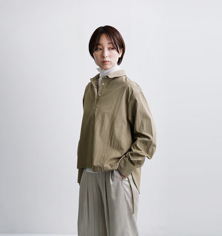 シワになりづらく、程よいワッシャー感のある素材。季節を選ばない程よい厚みの素材感で、春先から秋冬のニットのインナー使いまで、一年中あらゆるシーンで活躍してくれます。