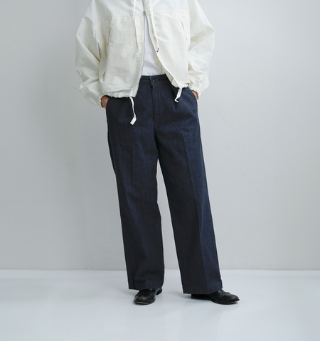 生地にはLeeが長年培ってきた技術を活かした2/1 JELT DENIMを採用。通常のデニムに比べて柔らかく、しなやかな風合いが特徴で、穿いた瞬間から体になじむ快適な履き心地を実現しています。長く愛用するほどに味わい深い表情へと変化。ワンウォッシュはネップ感のあるよりナチュラルな素材感です。シーズンを問わず着用できる適度な厚みで、デイリーに活躍する素材です。デニムのラフさとトラウザーの上品さを兼ね備えた、大人にこそ似合う一本に仕上がっています。