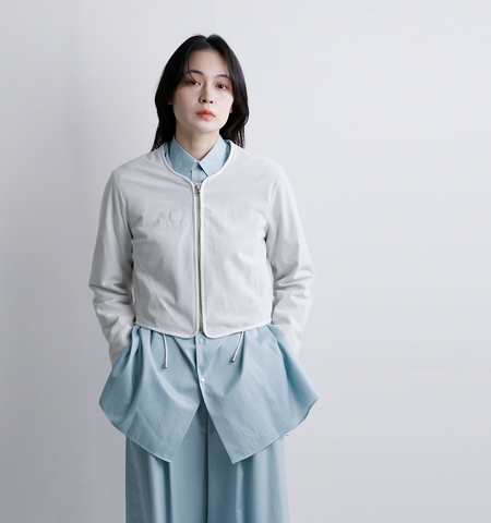 余計な装飾を削ぎ落としたノーカラーのデザインは、顔周りをスッキリと知的な印象に。シャツの襟を覗かせたり、ハンカチやスカーフを巻いたりと、首元のレイヤードがより際立つ設計です。フロントのジップ仕様が、ミニマルな中に程よいスポーティーさとモダンなアクセントを加えています。