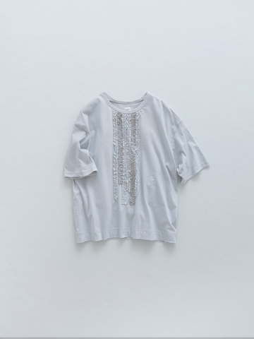 前身頃に施したフリルが特徴のTシャツ。華やかさはありながら、フリル部分にも天竺生地を使用することで甘くなりすぎず、デイリーコーデにすっと馴染みます。長さに違いを出すことにより、動きのある軽やかな雰囲気になっています。