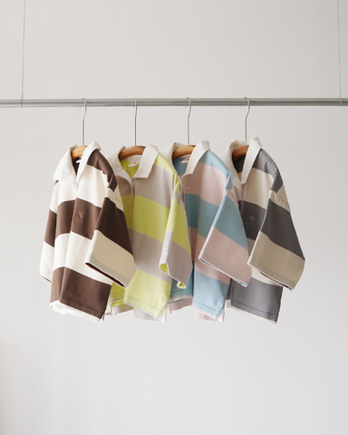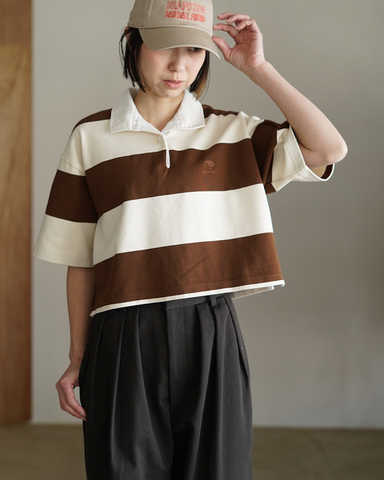 クラシックなボーダー柄が目を引く、クロップド丈のラグビージャージです。程よくコンパクトな着丈が全体のバランスを整え、すっきりとスタイルアップして見えるシルエットに仕上げています。