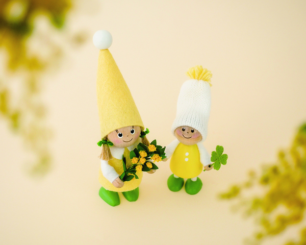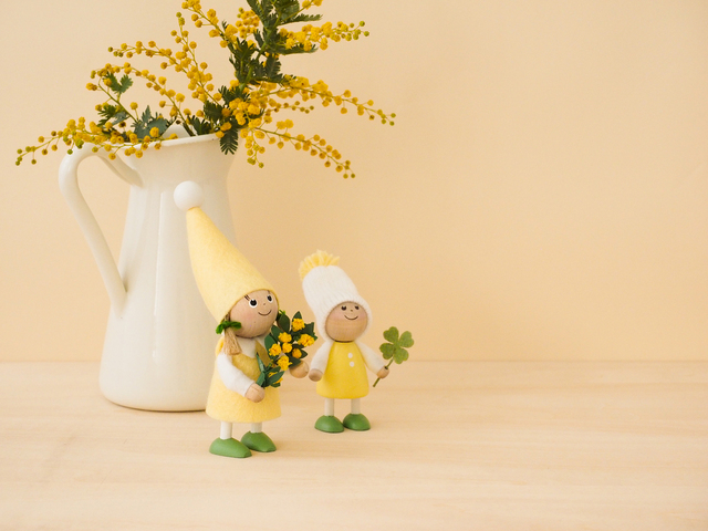 春を告げる花「ミモザ」を抱えた女の子と、幸せの象徴「クローバー」を持った男の子。 春のやさしい光のような黄色は、感謝と敬意のしるし。 春は、大切な人への感謝や新しい始まりを感じる季節。スプリングシリーズのノルディカニッセが、やさしい春の幸せをお届けします。