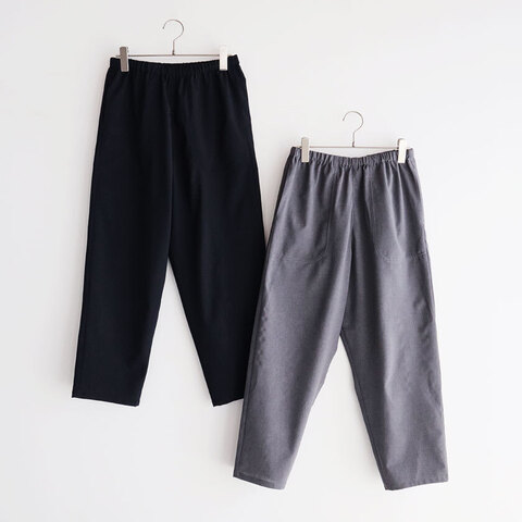 腰回りやヒップにほどよくゆとりを持たせたテーパードシルエット。脚のラインをさりげなくカバーし、すっきりときれいに見せてくれます。足首が見え隠れするクロップド丈がスマートな雰囲気を演出。ウエストは総ゴム仕様で、内側にはサイズ調節ができるドローコードが付いています。