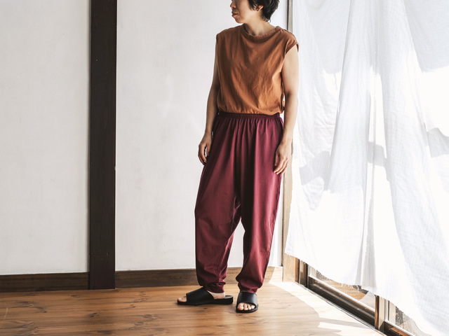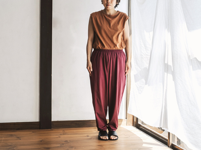 腰まわりはゆるっと、裾に向かって細くなるテーパードライン。