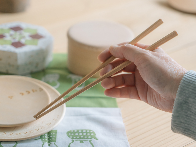 岩手県二戸市で、オノオレカンバ(斧折樺)を使ってつくられた五角形の箸です。使いやすく、指と指の間におさまりのいい形を探していたら五角形に出会いました。 箸先まで五つの角を残しているので、滑りにくく、麺類も楽に食べられます。品質の良い物を作る為、1本1本手で仕上げ、太さ、形、色を合わせ、1膳の五角箸が出来上がります。先の角を残せるのは、手作りならではの技です。