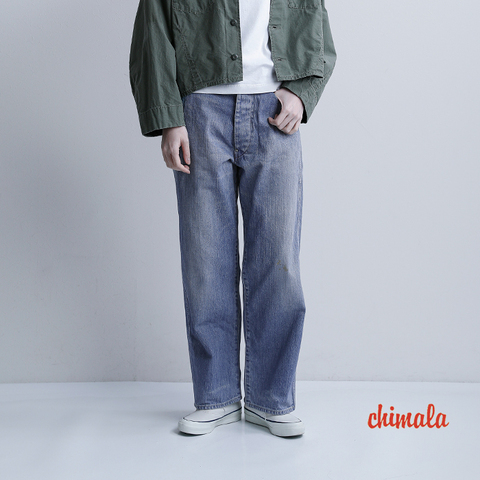 chimala(チマラ)より、ダブル幅デニム ウエストアジャスタブル パンツのご紹介です。13ozのダブル幅デニムを使用した、ユニセックス仕様のワイドシルエットパンツ。スモーキーライトの絶妙な色合いに、ほつれや色落ち、汚れ加工を施し、まるで何十年も穿き込んだかのようなヴィンテージ感を表現しています。