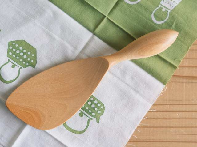 岩手県二戸市で、オノオレカンバ(斧折樺)を使ってつくられたしゃもじです。持ち手のぷっくりとした形が、蜂の胴体に似ていることからBee(ビー)と名づけられました。まるいふくらみが、手にピッタリとなじみやさしい使い心地です。ひねったデザインとへら先が平らなのが使いやすさの秘密です。デザインの可愛さと機能性を兼ねる人気アイテムです。