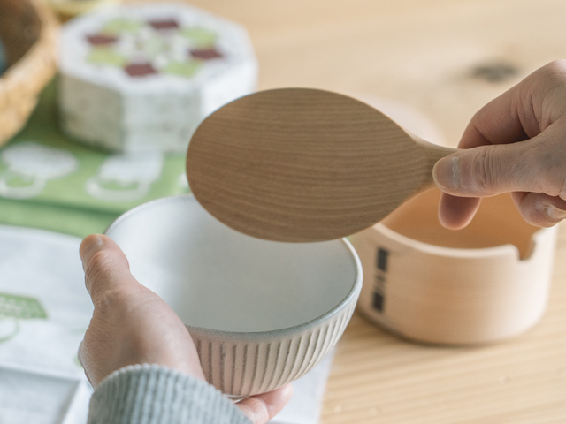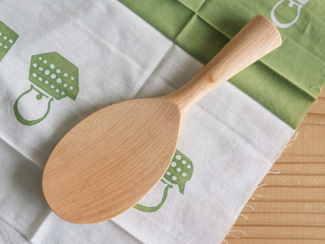 岩手県二戸市で、オノオレカンバ(斧折樺)を使ってつくられた木製のしゃもじです。ふっくらとした丸い形がかわいらしいしゃもじ、オーソドックスなタイプです。創業当時からの変わらないデザインが人気です。大皿に盛り付けたちらし寿司などに添えて。